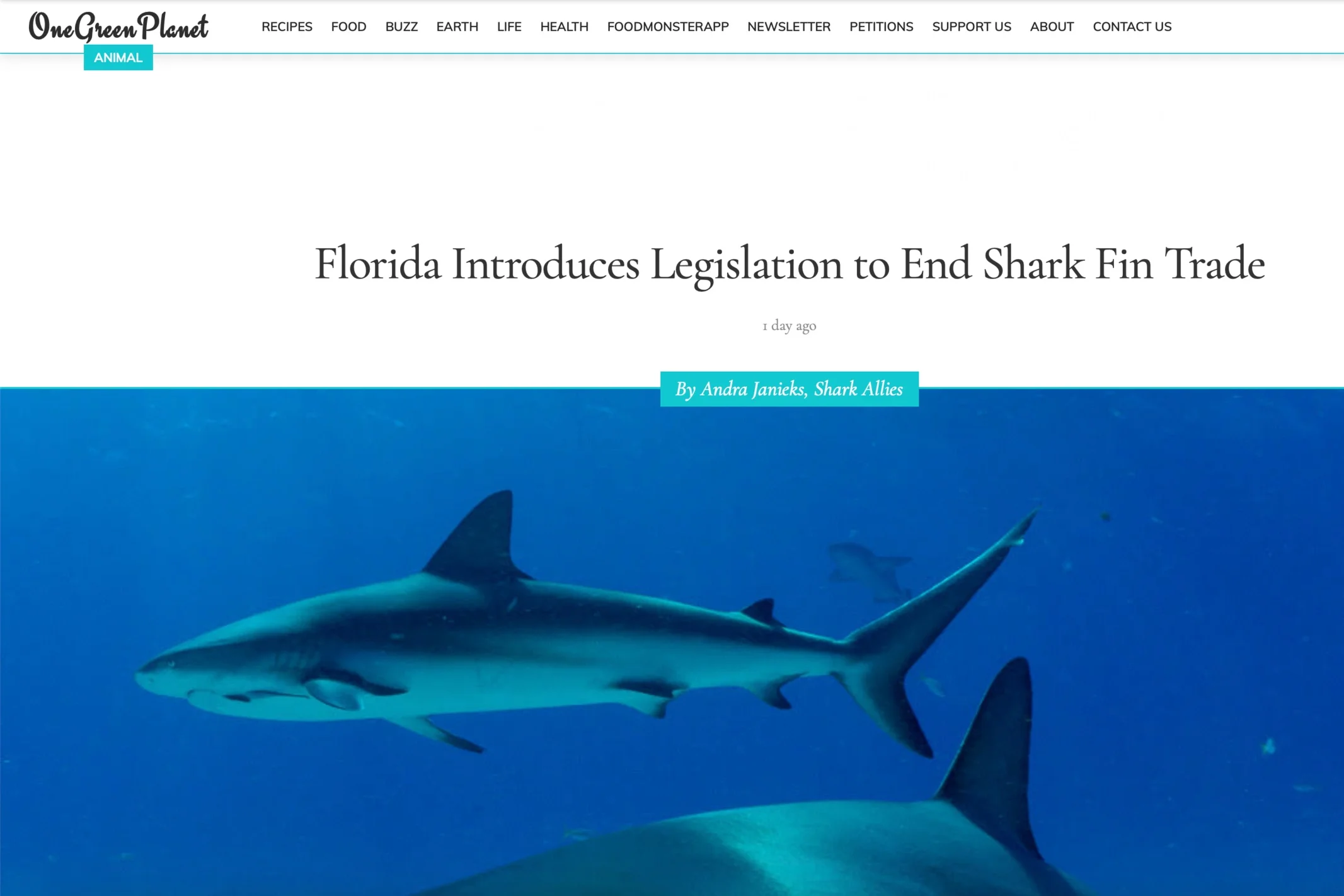 media & News Laurel Irvine 11/14/19 Laurel Irvine 11/14/19 Shark Allies to Florida Lawmakers: Sharks are Friends, Not Food - Deeper Blue Read More Laurel Irvine 11/11/19 Laurel Irvine 11/11/19 Saving Sharks in Florida with Stefanie Brendl - The Guy Harvey Podcast, Shark Task Force Read More Laurel Irvine 11/8/19 Laurel Irvine 11/8/19 Florida Introduces Legislation to End Shark Fin Trade - One Green Planet Read More Laurel Irvine 11/5/19 Laurel Irvine 11/5/19 Florida Considering Legislation To End Shark Fin Trade - Deeper Blue Read More Laurel Irvine 11/4/19 Laurel Irvine 11/4/19 Florida Introduces Bill To End The Shark Fin Trade In Florida - Sea Voice News Read More Laurel Irvine 10/22/19 Laurel Irvine 10/22/19 3 Questions with Guy Harvey - Florida Politics Read More Laurel Irvine 10/18/19 Laurel Irvine 10/18/19 Guy Harvey, Shark Allies Team Up to Highlight Shark Tourism - Florida Politics Read More Laurel Irvine 10/18/19 Laurel Irvine 10/18/19 Florida Lawmaker Takes Aim at Shark Fin Sales - Fox 35 Orlando Read More Laurel Irvine 10/18/19 Laurel Irvine 10/18/19 Here We Go Again! #NoFinFL Read More Laurel Irvine 9/13/19 Laurel Irvine 9/13/19 Guadalupe Island 2019 Trip Guest Blog by Taylor Meadows Read More Laurel Irvine 9/4/19 Laurel Irvine 9/4/19 Stefanie Brendl is Working to Save Sharks Through Legislation - KTLA News Read More Laurel Irvine 8/26/19 Laurel Irvine 8/26/19 Founder Interview - Don't Forget Your Boots Podcast Read More Newer Posts Older Posts