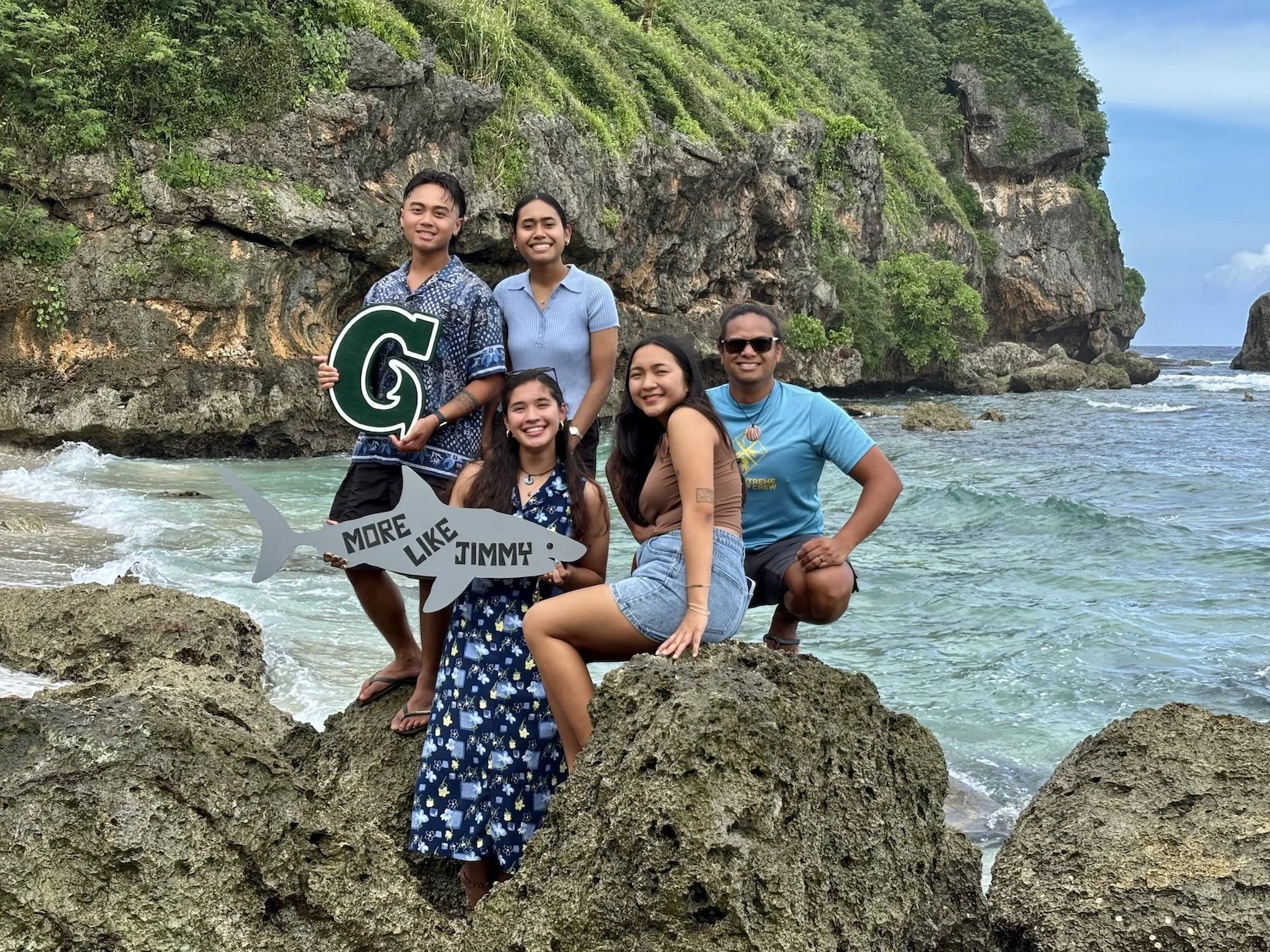 More Like Jimmy Scholarship Recipients 2025. Left to right: back row Nicolas Ubaldo, Sage Uchel, and Farron Taijeron; front row Mary Jolleen Perez and Ale’a Duenas.