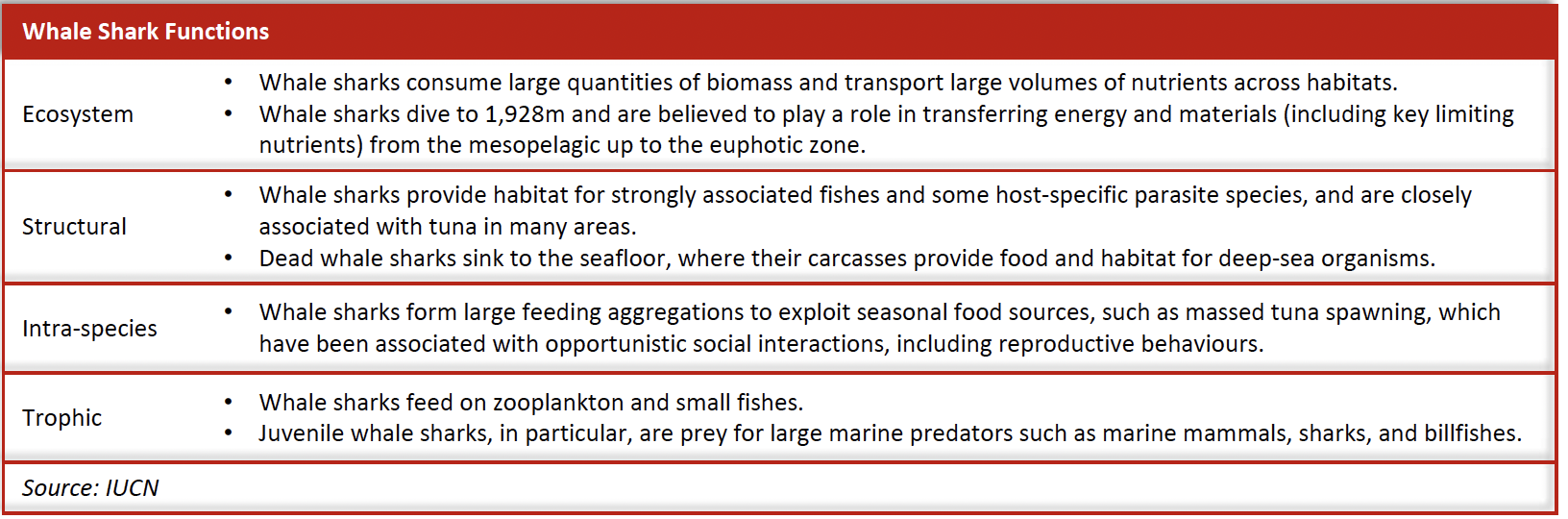 Tourism: whale shark viewing is available in multiple countries, including Australia, Belize, Cuba, Djibouti, Ecuador, Honduras, Indonesia, the Maldives, Mexico, Mozambique, Oman, Panama, the Philippines, St Helena, Saudi Arabia, the Seychelles, Tanzania and Thailand. According to studies in the early 2000’s and 2010’s, whale shark tourism was already worth multimillions, and according to Graham (2007), global whale shark tourism was expected to exceed USD 42m per year.
