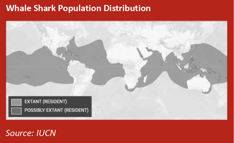 Globally, the whale shark, Rhincodon typus, population is decreasing according to the IUCN (based on the last assessment in 2016). Based on the 2016 IUCN Red List assessment, whale sharks were declared Endangered, and according to the 2021 IUCN Green Status assessment, the population is largely depleted.