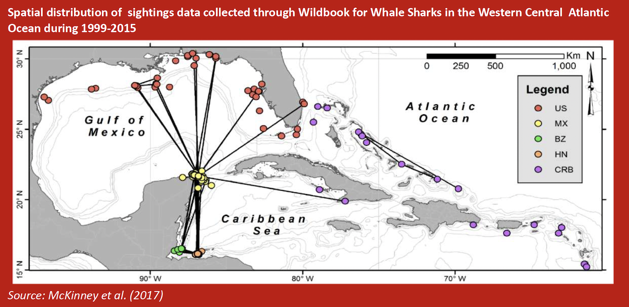 Mexico Population: Gulf of Mexico / Caribbean Sea: Off the Yucatán peninsula of Mexico, whale shark abundances are highest from May through September. The aggregation site in the Caribbean Sea off Mexico is a hotspot for the species (Hueter et al., 2013; Norman et al., 2017). The largest-known aggregation as of February 2016 identified 1,100 sharks (Norman et al., 2017) from 1992-2014, 48.6% of which were re-sighted in at least one other year.