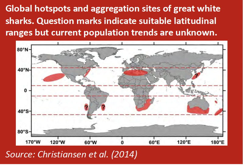Considering that it is now estimated that there are now less than 250 individual great white shark adults along the entire South African coastline, the likelihood is that the population will be extinct within 40-50 years. This makes the South African population Critically Endangered. Note: if the Andreotti et al. (2014) estimate was correct, the population could be functionally extinct within 10 years.