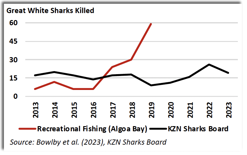 Between 2000 and 2023, the authors estimate that the KwaZulu Natal Sharks Board (KZNSB) and Demersal Shark Longline (DSL) accounted for 20 and 22 annual great white shark mortalities, respectively. The extraction of 5-10% of the population annually for more than two decades is unsustainable, especially considering the specific traits and life histories of the species.